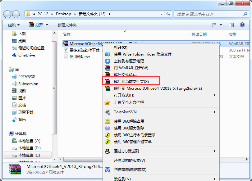 1、下載本站Microsoft Office 2013(64位)免費(fèi)完整版安裝包,之后右鍵選擇“解壓”(沒(méi)有解壓選項(xiàng)的需安裝解壓縮工具)。