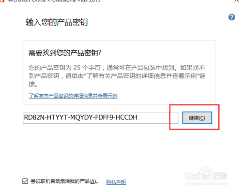 6、輸入產(chǎn)品密鑰,點(diǎn)擊繼續(xù)