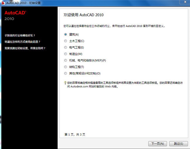 1、打開(kāi)已經(jīng)安裝好的CAD2010,在桌面上雙擊圖標(biāo)即可,根據(jù)大家自己所需要使用的行業(yè)進(jìn)行設(shè)置也可以跳過(guò)。