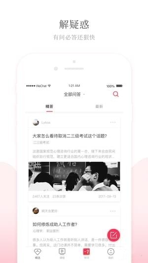 心圈子是為用戶打造的在線交流小組,這里會入駐大批心理咨詢師、心理學(xué)愛好者,進(jìn)行專業(yè)知識的探討、朋輩督導(dǎo)、答疑解惑。