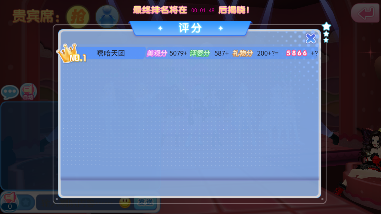 評分算法:人物服飾+T臺館內(nèi)道具+贈送禮物+評委評分(T臺館內(nèi)道具及贈送禮物加成更高哦~)