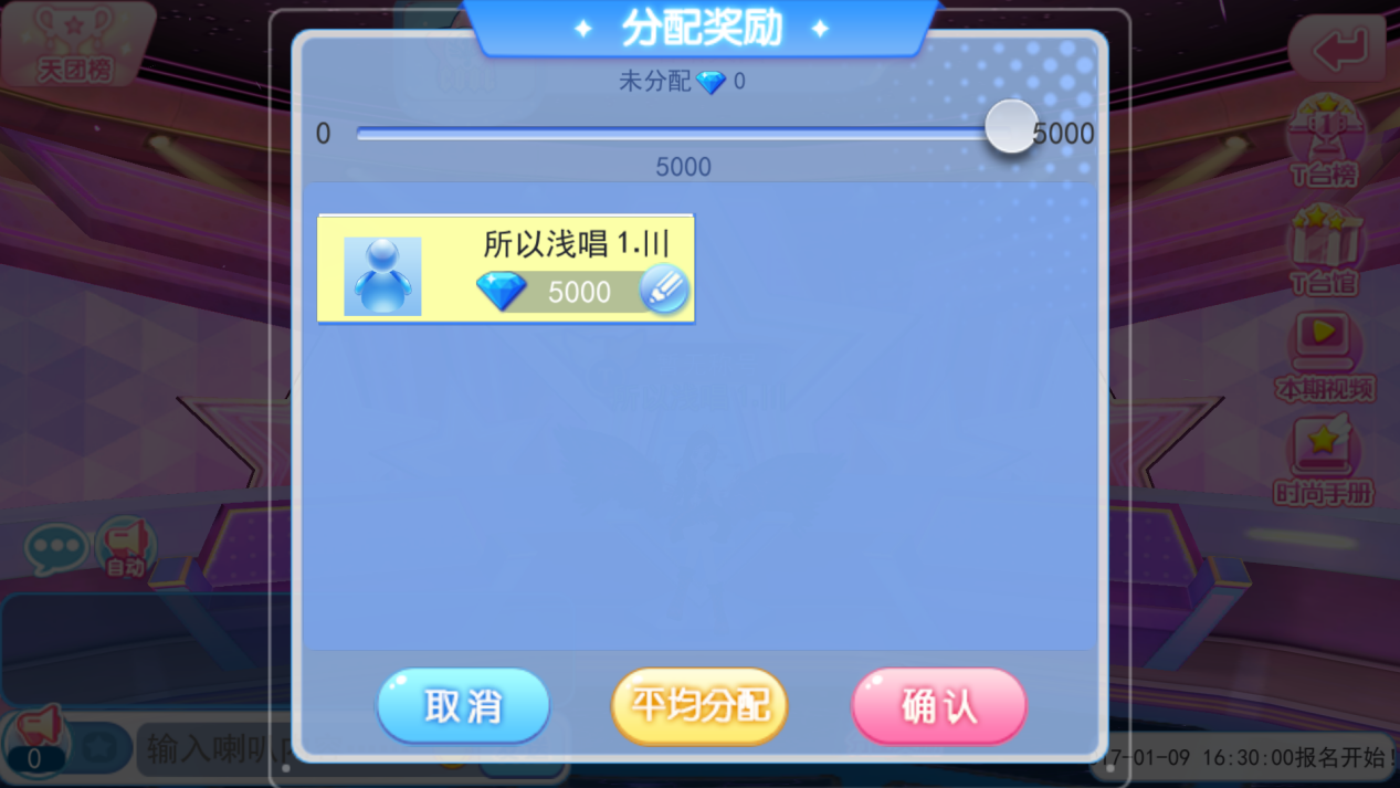 當(dāng)天所有天團(tuán)比賽完進(jìn)行結(jié)算,提前結(jié)束的天團(tuán)顯示的分?jǐn)?shù)并不是實(shí)際總分(T臺秀最后4分鐘所增加的數(shù)值是隱藏的哦)。結(jié)算完按照排名,最終團(tuán)長進(jìn)行分配鉆石獎勵。