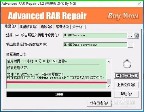 4、修復(fù)完成,彈出信息對話框:文件 N:\HDTune.rar 已經(jīng)修復(fù)成功 ! 現(xiàn)在你可以打開“N:\HDTune_recovered\”下修復(fù)后的壓縮文檔了。我們點擊:確定;