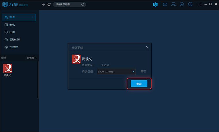 登錄成功后提示安裝《武俠乂》客戶端,確認(rèn)安裝目錄后點(diǎn)擊“確定”開始安裝