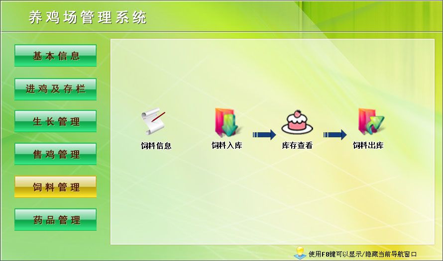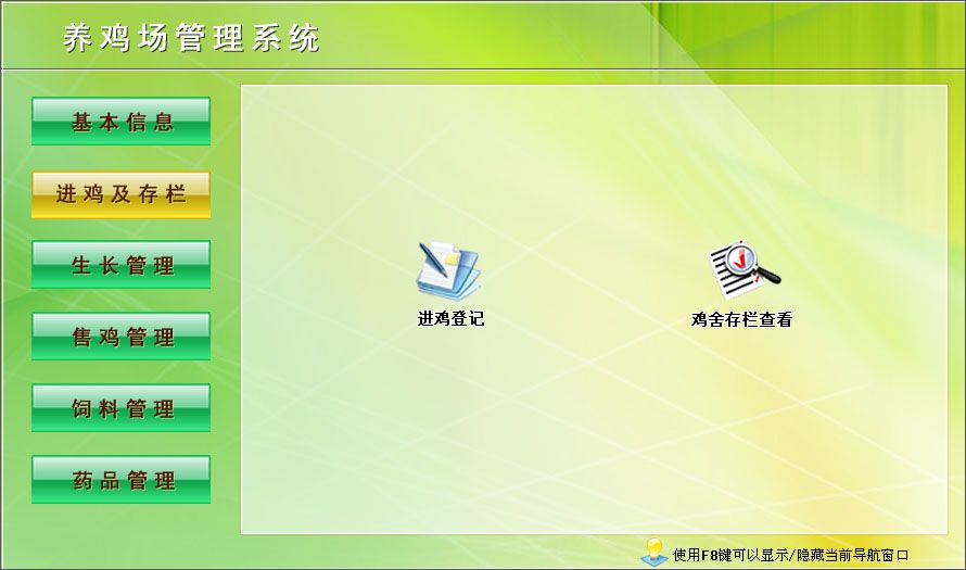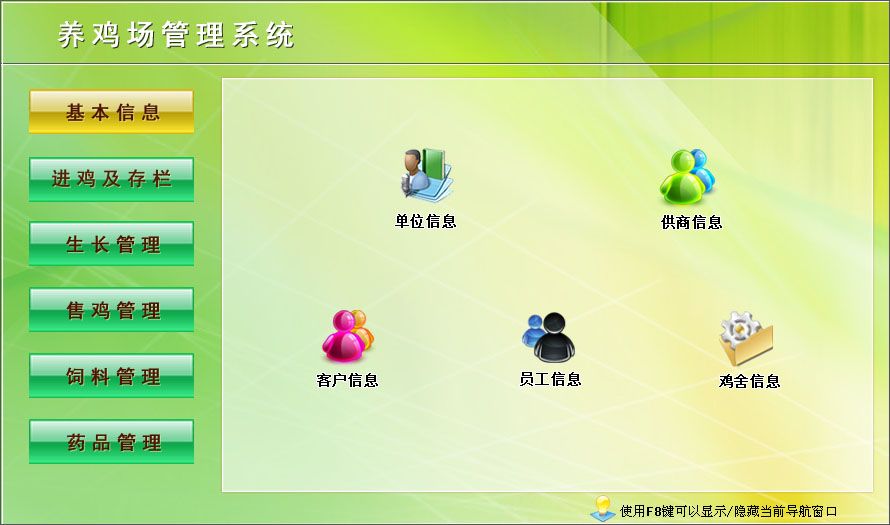 一、基本信息:單位信息、供商信息、客戶信息、員工信息、雞舍信息二、進(jìn)雞及存欄:進(jìn)雞登記、雞舍存欄查看