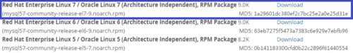 在頁面中找到對應(yīng)版本的下載地址(本例中為mysql57-community-release-el7-9.norach.rpm)。 建議將對應(yīng)版本文件名及MD5值記錄或者截屏。
