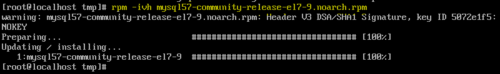按圖輸入并按回車鍵確定下載。 注意:mysql57-community-release-el7-9.norach.rpm為上一步版本文件名。