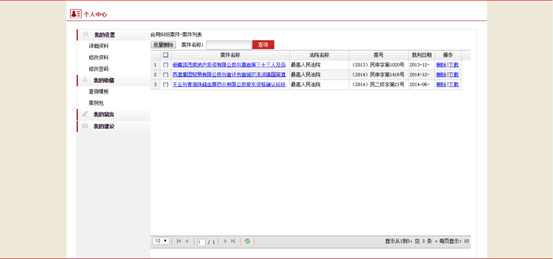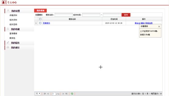 登錄用戶可以在個人中心-我的收藏-查詢模板中可以實現(xiàn)對查詢模板的查詢、刪除、名稱修改;點擊模板名稱鏈接,可以跳轉到以該查詢模板為檢索條件的列表頁;點擊個人中心-我的收藏-查詢模板中的查詢模板列表中的“查看信息”,可以查看用戶從上次登錄到此次登錄期間,該查詢模板條件下,新增加的文書數量。