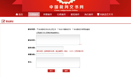 中國裁判文書網提供與用戶互動的建議、留言功能