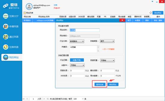在“我的網(wǎng)站”選擇你要暫停交換的網(wǎng)站、點擊“修改”、 在選擇點擊“暫停交換”即可。