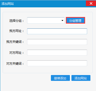 四、回到添加網(wǎng)站界面,選擇分組,補(bǔ)充我方網(wǎng)址、關(guān)鍵詞和對方網(wǎng)址、關(guān)鍵詞,最后點擊“添加網(wǎng)站”或者可以“繼續(xù)添加”。