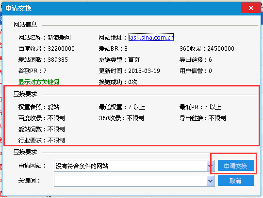第三步:點擊“申請交換”彈出網(wǎng)站信息詳細(xì)窗口、網(wǎng)站信息處是對方網(wǎng)站各項SEO數(shù)據(jù)、互換要求處為對方網(wǎng)站設(shè)置的換鏈條件、申請網(wǎng)站處是所有符合對方互換要求的網(wǎng)站、如有多個網(wǎng)站可點擊下拉選擇便可、關(guān)鍵詞處為申請網(wǎng)站對應(yīng)的關(guān)鍵詞、如有多個關(guān)鍵詞可點擊下拉選擇。