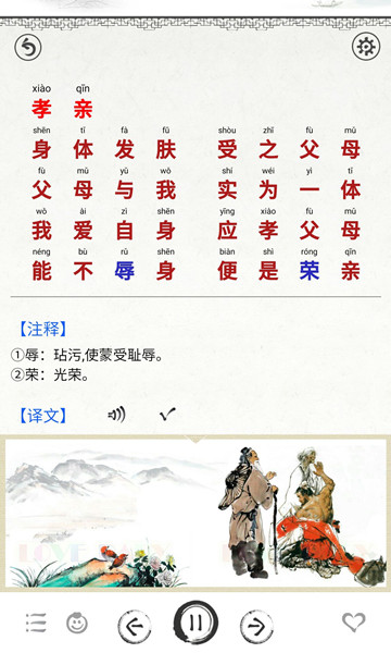 7、背景音樂為國學(xué)古典音樂,貼切主題,聽國學(xué)時(shí)感覺美妙無比。