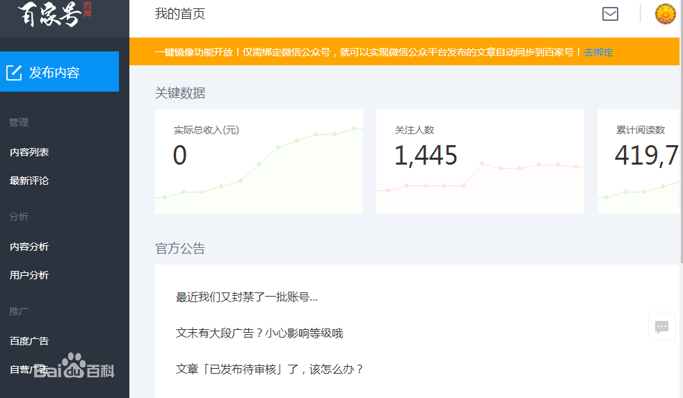 每一篇百家號文章,在首頁左上角醒目位置都有標(biāo)志,引導(dǎo)用戶進(jìn)入作者的個人主頁并對作者進(jìn)行關(guān)注。作者可根據(jù)百家號提供的工具分析粉絲的人群屬性,并通過個人主頁針對粉絲展開各種運(yùn)營活動。