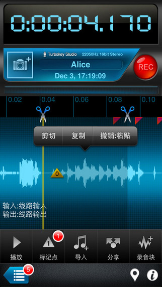 易于回放:支持Airplay,可使用藍(lán)牙音箱回放,0.5,1.5, 2倍變速播放,。快進(jìn),快退,循環(huán)播放控制易于管理:從標(biāo)記點(diǎn)列表中選擇標(biāo)記點(diǎn)可以快速定位及重聽(tīng),可以給標(biāo)記附加圖片和文字說(shuō)明,錄音可分類管理,可以給每個(gè)錄音附加圖片和文字說(shuō)明,除了錄音時(shí)增加標(biāo)記點(diǎn),也可在錄音完成后增加標(biāo)記點(diǎn)和注釋。