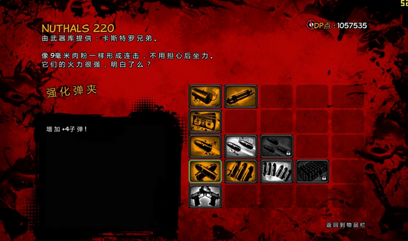 手槍,這是主角自帶的遠程武器,這武器升級方案是均衡分配,每個功能都升級1到兩點即可,也不要太多的點,留給其他的武器。前期作為主要攻擊武器,到了后期用處不大,偶爾做為主武器彈藥不夠的時候臨時救急用。