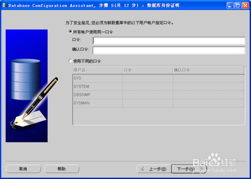 為簡(jiǎn)化評(píng)估用數(shù)據(jù)庫的密碼設(shè)定,選擇所有的帳戶都使用同一個(gè)口令,輸入 SYSTEM 等用戶的口令(口令不要以數(shù)字開頭),并按下一步按鈕