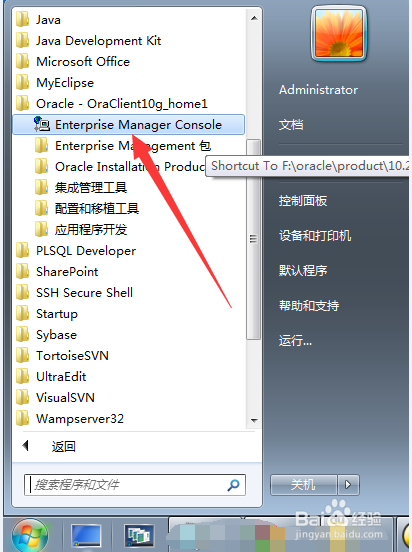 點(diǎn)擊電腦菜單鍵,找到安裝好的oracle -OraClient10g_home1,點(diǎn)擊點(diǎn)擊Enterprise Manager Console