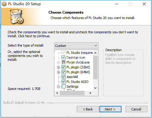 6、選擇軟件安裝類型和功能,小編系統(tǒng)是64位的,所以把flstudio32位勾選掉,點擊next