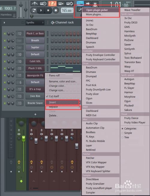 首先,打開 FL Studio 軟件,在通道列表中任意選擇一個通道,右擊,選擇插入或替換,打開插件選擇器或更多插件。