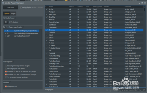 彈出插件管理器窗口,點擊右下角的管理插件,彈出水果軟件自帶的 FL Studio 插件管理器,設(shè)置好掃描路徑或添加路徑,當加入一個路徑以后,前面選框勾選則代表被激活,將會掃描到這個路徑。