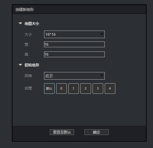 創(chuàng)建地圖的大小,這里和WE中新建地圖非常類似,初始地形的風(fēng)格就類似WE中你選擇草地,城鎮(zhèn)一類的初始填充