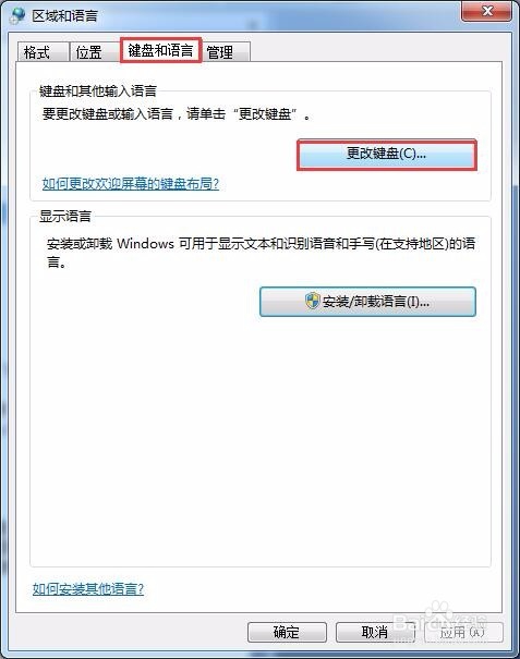彈出“區(qū)域和語(yǔ)言”對(duì)話框,選擇鍵盤(pán)和語(yǔ)言選項(xiàng)卡。單擊“更改鍵盤(pán)”按鈕。