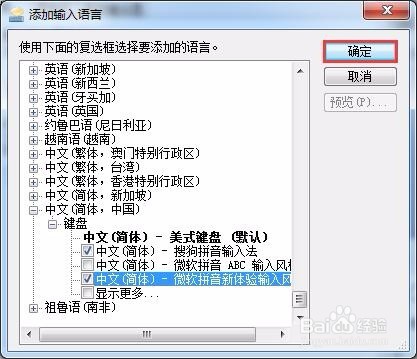 彈出“添加輸入語(yǔ)言”對(duì)話框,在輸入法列表中選中微軟拼音輸入法,單擊“確定”按鈕。