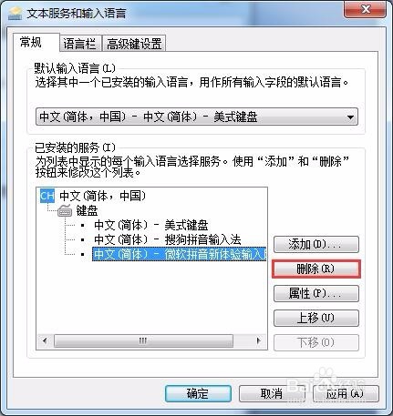 返回“文本服務(wù)和輸入語(yǔ)言”對(duì)話框,微軟拼音輸入法已經(jīng)添加,如果要將其刪除,則選中該輸入法,然后單擊“刪除”按鈕,最后單擊“確定”按鈕。