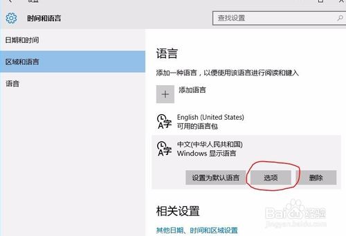 在“語(yǔ)言”項(xiàng)中點(diǎn)擊打開(kāi)“中文(中華人民共和國(guó))windows顯示語(yǔ)言”,再點(diǎn)擊打開(kāi)“選項(xiàng)”