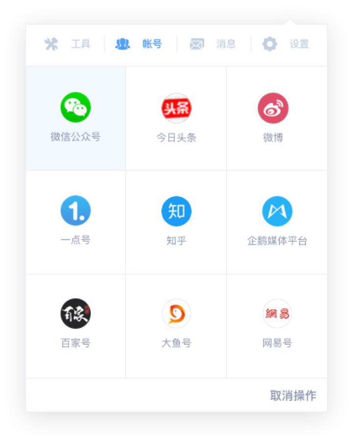 管理你所有的新媒體帳號(hào)一個(gè)工具管理你的所有新媒體帳號(hào)(支持包括微信公眾平臺(tái)、今日頭條、一點(diǎn)資訊、微博、知乎、網(wǎng)易媒體平臺(tái)、搜狐開放平臺(tái)、企鵝媒體平臺(tái)、UC大魚號(hào)、簡書、百度百家等11家新媒 體平臺(tái))。