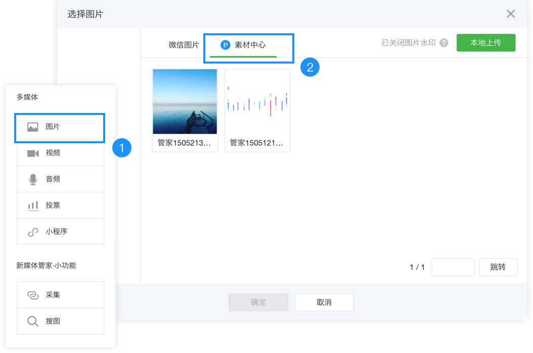 在微信公眾平臺(tái)圖文編輯器頁面中點(diǎn)擊右側(cè)工具欄 圖片,打開圖片插入頁面,選擇素材中心,即可使用素材中心中的圖片素材。