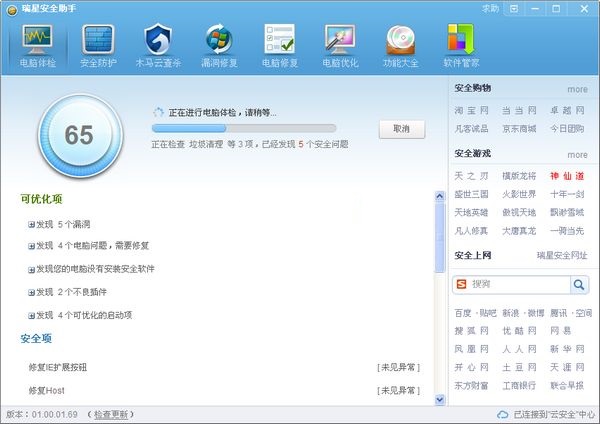 1.自動(dòng)收集、分析、阻截木馬攻擊、黑客入侵及網(wǎng)絡(luò)詐騙2.一鍵體檢并評(píng)出安全得分