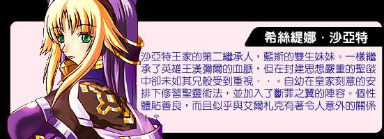 愛斯玲.綠.圣亞里昂 圣焰的英雄-雷歐哈特之女,同時也是修羅將軍-西撒之妹。雖身為女兒身,但在其父與其兄諸多英雄事跡的渲染下,愛斯玲亦有著一手習自摯友幽彌的百步穿楊、巧射弓技。