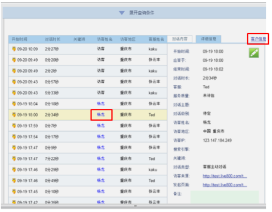 點擊列表中的“訪客姓名”,您可以查看客戶的詳細信息,包括對話記錄、留言記錄、跟進記錄等。