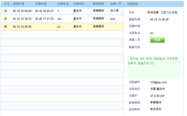 您可以查看網(wǎng)站訪客留言。留言可以顯示網(wǎng)站訪客的姓名、IP、地區(qū)、電子郵件及留言內(nèi)容,客服可以將留言歸類,并通過該頁面快速回復郵件。