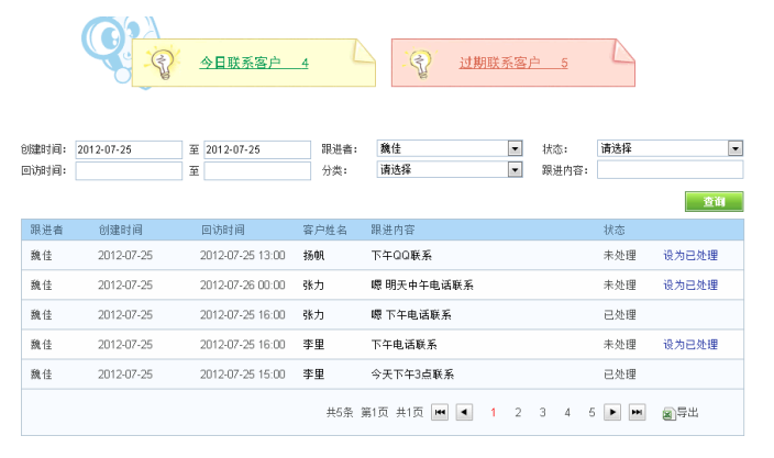 您可以通過多種條件查詢您添加的跟進記錄信息。當您點擊查詢后,會以列表的信息顯示所有相關(guān)的跟進記錄(如下圖),在這個頁面您可以進行以下操作: