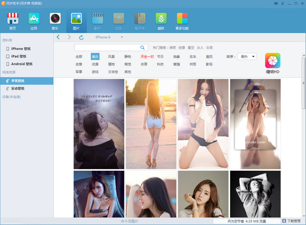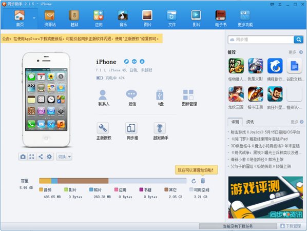 1、支持iOS/Android雙平臺同步助手在不越獄的情況下不僅可以高速下載到海量游戲應用,還具備鈴聲/壁紙下載、清理系統(tǒng)垃圾、固件下載、備份個人數(shù)據(jù)等管理功能,具有方便易用、海量資源等優(yōu)勢。同時也提供了對所有iPhone、iPad及iTouch蘋果設(shè)備的全面支持,XP/Vista/Win7/Win8系統(tǒng)均可運行。