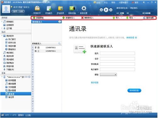 11、再介紹一下通訊錄的備份與恢復,選擇設(shè)備中的“通訊錄”,這時就可以看到在設(shè)備中所有的通訊的信息了,然后可以選擇“新建聯(lián)系人”“刪除聯(lián)系人”“導入”與“導出”,這個“導入”與“導出”就是“備份”和“恢復”。