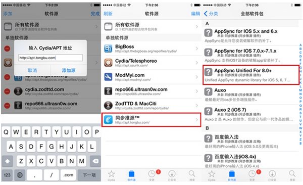 5.Cydia安裝破解補丁Appsync:cydia里點擊軟件源--編輯--添加--輸入apt.tongbu.com,添加源成功后,進入同步推源,找到Appsync Unified for iOS8.0+進行安裝