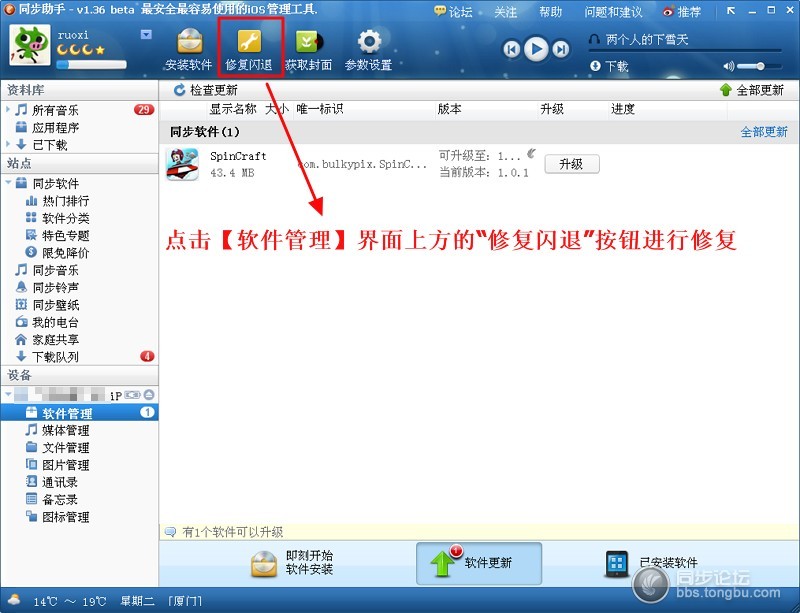 2、連接設(shè)備到電腦,在設(shè)備區(qū)的軟件管理界面,點擊上方的【修復閃退】按鈕進行修復。