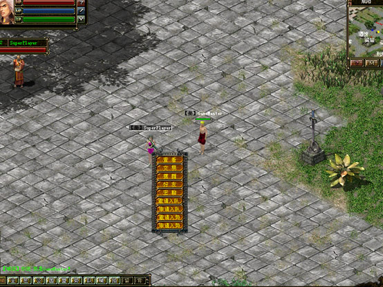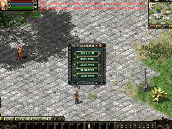 右上角為游戲小地圖;左上角頭像旁邊由上至下依次是,紅色生命槽,藍(lán)色體力槽,綠色潛能槽; 左下方為信息顯示窗口;右下方標(biāo)記著狀態(tài)、物品等為游戲功能菜單;窗口正下方F1-F8為技能欄,標(biāo)記著“右”字的為當(dāng)前使用修煉的主動(dòng)技能;