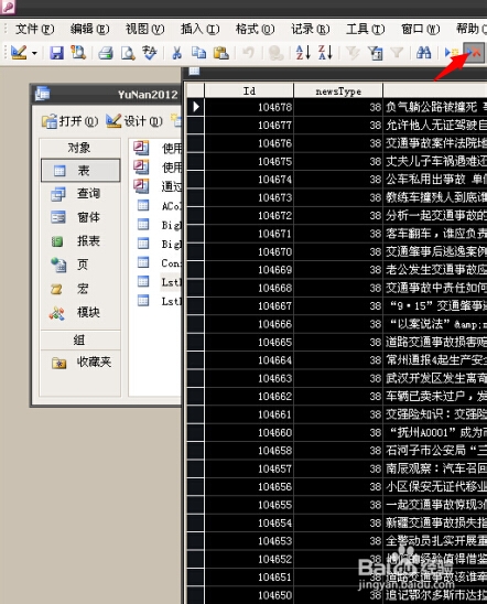 打開我們存儲(chǔ)數(shù)據(jù)的access數(shù)據(jù)庫,這邊我的新聞表已經(jīng)存儲(chǔ)8w多條數(shù)據(jù),我想刪掉一些數(shù)據(jù),只余下100多條數(shù)據(jù),根據(jù)以往的經(jīng)驗(yàn)我們是要選中全部的數(shù)據(jù)【預(yù)留100條數(shù)據(jù)】然后點(diǎn)擊刪除鍵才行的如下面的圖二,進(jìn)過昨天知道更好的辦法了,繼續(xù)往下走起~~