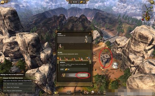 有金礦的領(lǐng)地就在出生點(diǎn)的上方,點(diǎn)一下敵人的營(yíng)地就會(huì)看到上圖所示的面板 移動(dòng)到Delive上,可以看到價(jià)格是30單位金錢(qián),點(diǎn)擊一下,你的貿(mào)易辦公室的小販