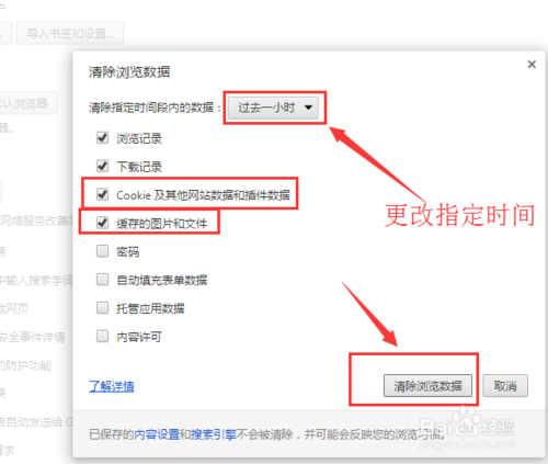 5.勾選要清理的內(nèi)容,以及清理的時間范圍,確認后,點擊【清除瀏覽數(shù)據(jù)】進行清除