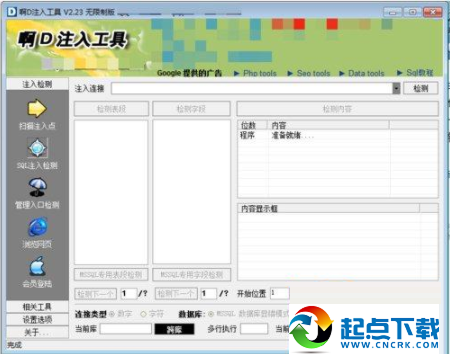 啊D注入工具是一款SQL注入漏洞檢測工具,這款軟件能自動掃描網(wǎng)頁是否包含SQL注入漏洞,可供站長檢測自己網(wǎng)站的安全性,及時修復漏洞保證網(wǎng)站安全使用,但是有一定的危險性,請使用者必須在法律容許范圍內(nèi)使用本軟件,如超出法律容許范圍使用軟件造成的后果由使用者承擔。