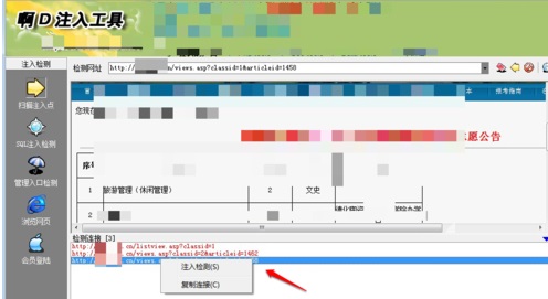 5、如果檢測發(fā)現(xiàn)有注入點,可以先任意選擇一個注入點,右鍵選擇“注入檢測”檢測注入是否可用
