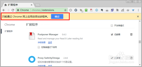 由于一些特殊原因,極個別Chrome插件在使用上述的安裝方法的時候,Chrome會提示"只能通過Chrome網(wǎng)上應(yīng)用商店安裝該程序"。
