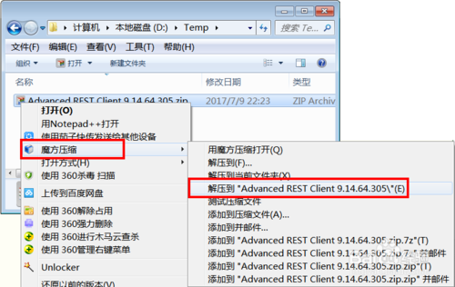 右鍵點擊該文件,并使用壓縮軟件(如魔方壓縮、360壓縮等)對該壓縮文件進行解壓,并保存到系統(tǒng)的一個任意文件夾下。