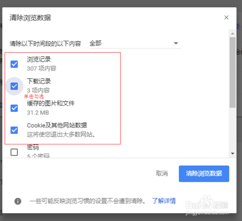 在勾選清除內(nèi)容的時候,請注意以下截圖中標紅的項,如果把“密碼”選擇勾上,那所有的網(wǎng)頁的用戶名和密碼將會被清除,所以在勾選這一項的時候請慎重,如果清除了,導(dǎo)致登錄某些網(wǎng)站要重新輸入密碼。